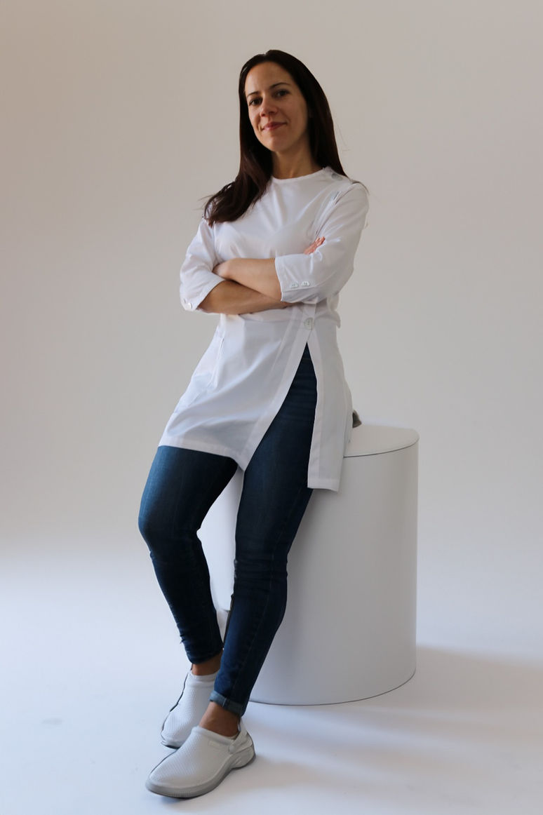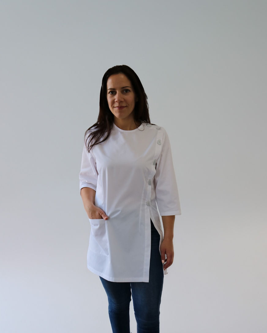 Bata de senhora a apertar ao lado com botões elegantes e diferenciados.