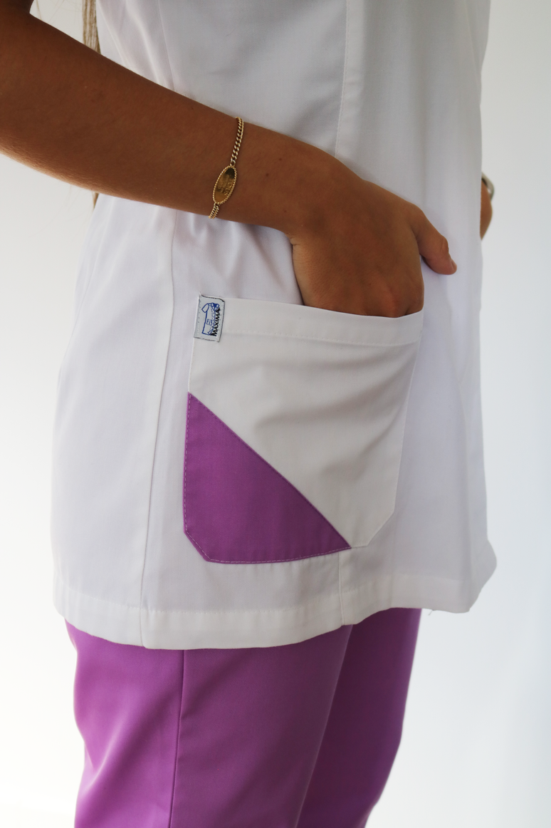 Túnica bicolor de manga curta, aperto ao lado com molas escondidas, 3 botões à vista na parte superior.