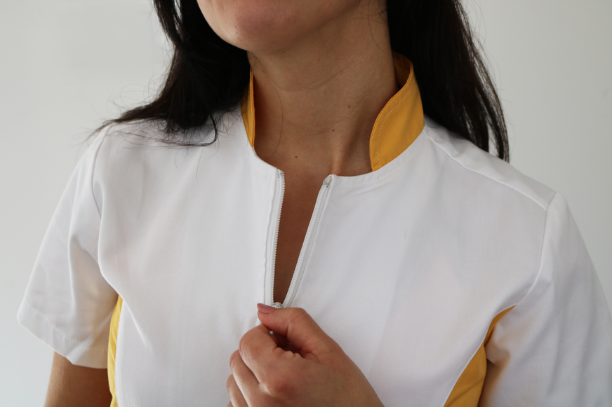 Túnica com fecho na frente, com 2 bolsos elegantes metidos nos cortes laterais, com gola mandarim.